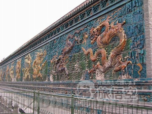 大同市市街の東街に位置し、1392年、明の太祖朱元璋の第13子朱桂の屋敷の前に建てられた影壁(寺廟や大邸宅の大門の外側に立てられる壁)です。邸宅は兵火で破壊され、九龍壁だけが残っています。長さは45.5m、高さ8m、厚さ2m。下部は須弥壇で、束腰の部分に獅子、虎、象、唐獅子、麟麟、天馬等の動物が彫られており、その姿はそれぞれ異なり、大変躍動的です。
