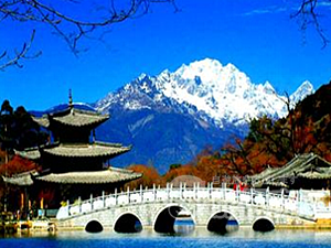 園内の湖水に、麗江のシンボルともいえる玉龍雪山が美しく映え、市民の憩いの場ともなっている公園です。麗江古城から徒歩で20分ほどです。