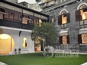 総面積は約4000平方メートル、港務局から続く通りの媽閣街に沿って東西120メートルの奥行きを持つ堂々たる邸宅。母屋のほか使用人部屋や人力車庫などの長屋が中庭を取り囲む伝統的な中国家屋でありながら、インドや西洋のデザインを取り入れた建築や装飾が特徴です。例えば、外壁はヨーロッパ風の灰色レンガ、インド式の真珠貝の窓枠に中国式の格子窓が取り付けられたりしています。