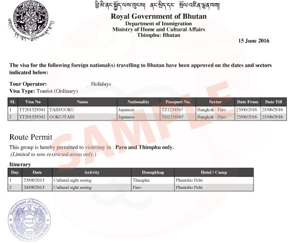 ※外国籍旅行者がブータンを訪れる場合、ガイド、ホテル、全食事、移動手段の全てが含まれるパッケージスタイルが基本となり、フリープランでの渡航は出来ません。またブータンへはビザが必要です。現地観光手配完了後、ご旅行前2週間以上前に弊社が代行して取得致します。(ビザ取得に時間がかかる為、ご旅行の3週間前(土日祝含まず)までにお申し込み下さい。(ビザ代実費20US$は旅行代金に含まれます)