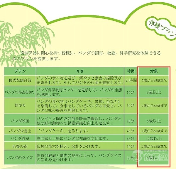![]() ※パンダ飼育体験は10歳以上65歳以下が対象となります。9歳以下のお子様は参加できません。 ※パンダ園の規定では12歳以上から体験参加となりますが、弊社では申請して10歳以上であれば体験可能となります。
