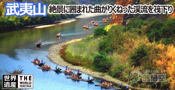 ◆ 武夷山風景区 武夷山風景区は、武夷山市区の南約15㎞の所にある武夷山観光のメインエリア。景勝地区は南北12㎞、東西5㎞の広大な面積を有し、その風景は奇秀甲於東南(奇観にして秀逸な風景は中国東南で武夷山が一番)と称される。1999年12月にはユネスコの世界遺産(文化と自然の複合遺産)に登録された。 ◆ 九曲渓景区 武夷山風景区の中を西から東に流れる九曲渓という山沿いに広がる景勝地。ここをいかだに乗って楽しむのが武夷山観光の目玉の一つ。出発点の星村から終点の武夷宮までは約10㎞。途中。いかだから眺める両岸の奇岩は絶景。 ◆ 天遊峰景区 九曲渓の北に位置する天遊峰は、海抜410mの峰群で、天気のいい日は山頂から雲海が見渡せ、その様子が雲が遊んでいるように見えることから名付けられた。 ◆ 大紅袍景区 烏龍茶や紅茶となる武夷山の有名な「大紅袍」茶樹は、天心寺の和尚がこのお茶の葉をとある貴人飲ませ、病を治したとう言い伝えがあり、古代より皇帝への献上品として大切にされてきた。今でも広大な畑から取れる茶葉はほんの少しで、あまり市場に出回ることのない高級品となっている。 |