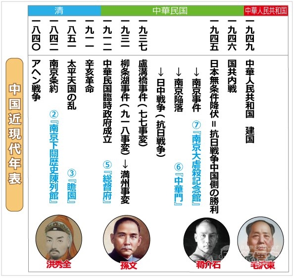 1840年6月清国と英国によるアヘン戦争が勃発、1842年8月講和条約『南京条約』が下関区の川に停泊しているイギリス艦「コーンウォリス」で調印され、清国は香港島を割譲した。かつて南京下関港の船客待合所として利用されていた建物で、現在は歴史陳列館として下関区沿江の歴史や中国近代史初の不平等条約とされる南京条約、その後の近代化運動(洋務運動)に関する資料が展示されている。 【瞻園 / 太平天国歴史博物館】 太平天国時代•東王楊秀清の王府跡地であり、国内唯一の太平天国歴史博物館となっている。600年以上の歴史がある江南名園としても知られ、門には清代乾隆帝直筆の「瞻園」の二文字が刻まれている。 【総統府】 1911年 辛亥革命~1949年 中国解放まで、100余年に渡り、中国の政治・軍事の中枢であり、孫文や蒋介石が執務室として利用した政府跡。日中戦争の南京戦では、総統府正門において日本軍は南京占領後、この前で入場式を行なったと言われている。南京でも人気の高い観光地。 【南京大虐殺記念館】 2007年に拡張リニューアルオープンした南京大虐殺の記念館。記念碑や遺骨、資料、パネルなどで当時の様子を伝えている。収蔵品の一部は元日本兵から寄贈されたもの。地下が南京大虐殺の資料館になっている。中国の歴史教育(愛国教育)の目的も兼ねた施設であるものの、日本の各団体から植樹された花壇などがあり、日中友好や平和を考えさせられる場所。 |