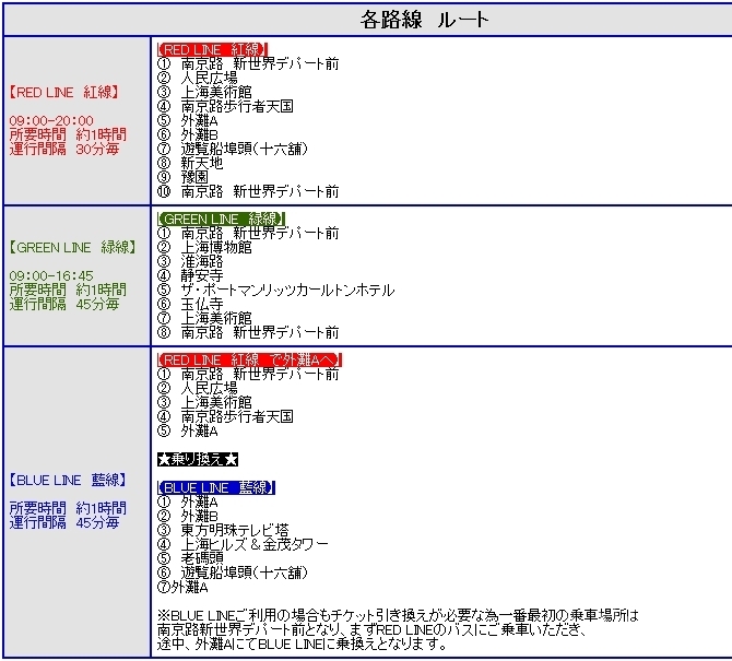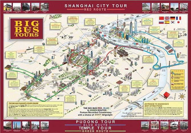 ビッグバス社の観光ルートには、人民広場+外灘(赤色ルート)、外灘+浦東新区(青色ルート)南京路+淮海路(緑色ルート)が含まれます。各バスは個人用デジタル観光案内システムを装備しており、北京語、広東語、英語、日本語、韓国語、フランス語、ドイツ語、イタリア語、スペイン語、ロシア語の音声観光案内からお選びいただけます。 |
