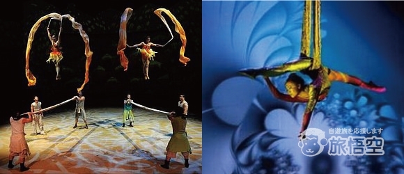 ★シルクベルト空中造形 男女入り乱れで天井から吊るされたシルクのベルトにからだを巻きつけ、巻きつけられた者同士が絡み合いアクロバット技を披露するというもの。首にベルトを巻きつけた女性がクルクル回ったり、巻きつけた紐を解きながら上から降りてくるシーンなどは見逃せません! |