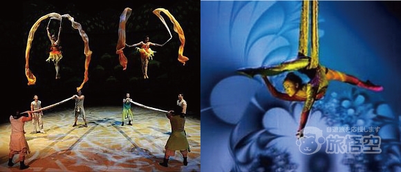 ★シルクベルト空中造形 男女入り乱れで天井から吊るされたシルクのベルトにからだを巻きつけ、巻きつけられた者同士が絡み合いアクロバット技を披露するというもの。首にベルトを巻きつけた女性がクルクル回ったり、巻きつけた紐を解きながら上から降りてくるシーンなどは見逃せません! |