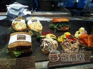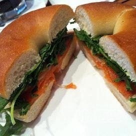 ~今日のオススメ~のスープ、サラダもランチタイムに人気。 ~スモークサーモンベーグル~をチョイス。クリームチーズ&ルッコラがたっぷり! 他にもランチに人気の、パニーニやオープンサンドもあります。 店内は、ワインや、ホームメイドのグラノラも販売されています。 |