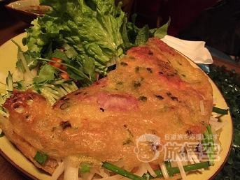 ベトナム風お好み焼き。薄い卵のパリパリ生地の中は、もやし、ニラ、お肉、海老など具だくさん。レタスに、ミントや胡瓜と一緒に包んで頂きます。