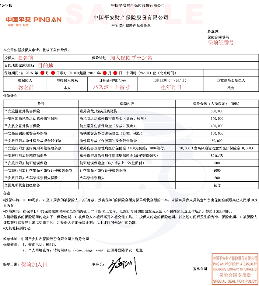 ※上海市内の場合→ 航空券と併せてお届け、ご集金の場合は1枚からでも配達料無料 ※保険のみお申込みの場合、日本のクレジットカード決済後、保険証控えをメールでご送付(カード手数料3%要) (保険のみお申込みで上海市内にお届け、ご集金の場合は配達料別途50元 要) ※会社請求される場合、弊社にて別途会社の宛名を記載した服務式発票の発行が可能です。 ※企業様で、ご出張される社員の方への保険導入を前向きにご検討頂けるようであれば、弊社の担当者がご説明にお伺いさせて頂きます。お手数ですが こちら よりご連絡頂けましたら幸いです。 ![]() |