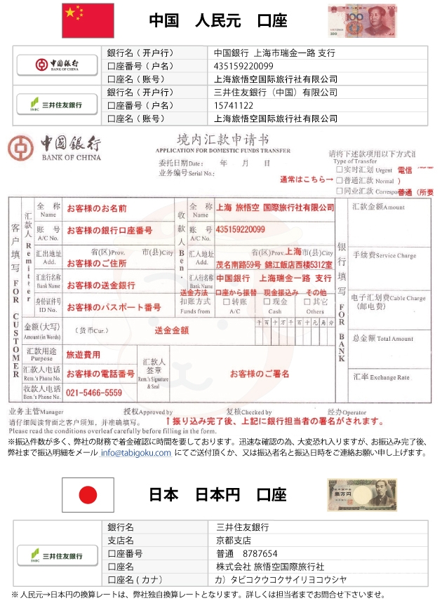A. 中国国内の銀行口座(人民元)へのお振込による決済が可能です。 ※上海旅悟空国際旅行社 口座